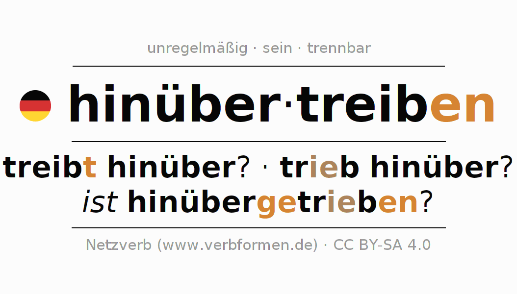 - Präsens: treib(e) (du) hinüber, treiben wir hinüber, treibt (ihr) hinüber, treiben Sie hinüber
