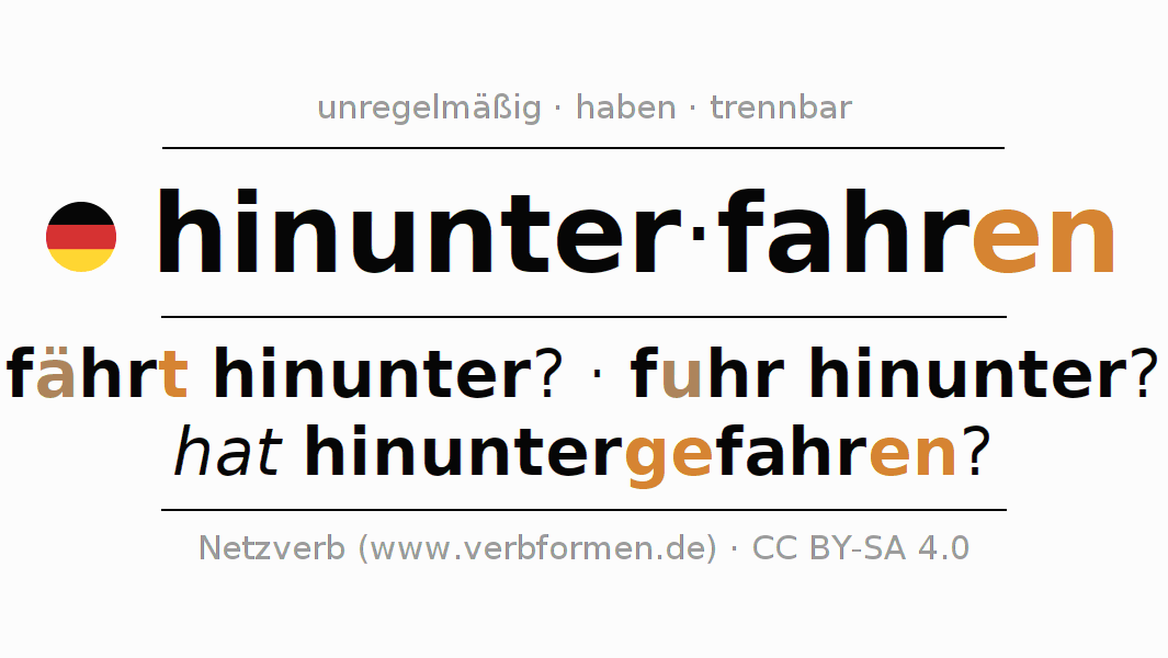 - Präsens: fahr(e) (du) hinunter, fahren wir hinunter, fahrt (ihr) hinunter, fahren Sie hinunter