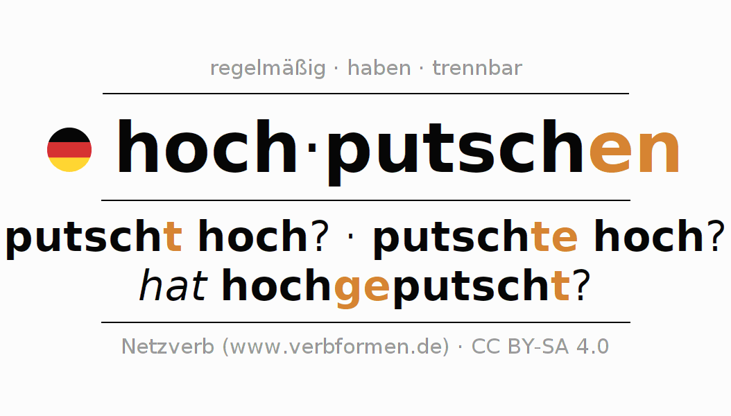 - Präsens: putsch(e) (du) hoch, putschen wir hoch, putscht (ihr) hoch, putschen Sie hoch