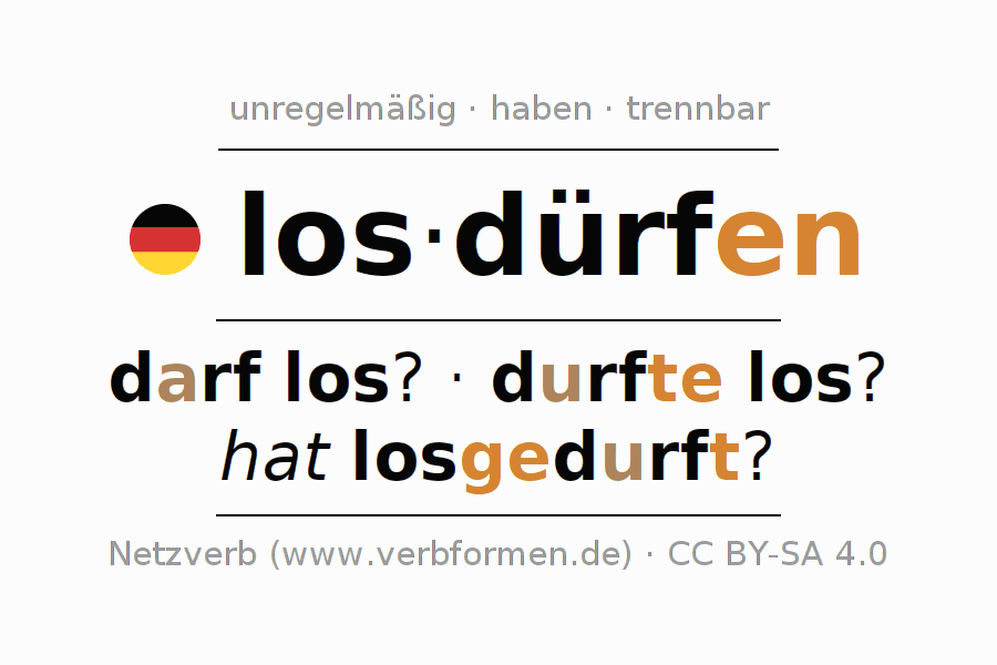 Die los·dürfen Konjugation online als Verbtabelle mit allen Verbformen in Singular (Einzahl) und Plural (Mehrzahl) in allen Personen (1. Person, 2.Person, 3. Person) übersichtlich dargestellt. Die Beugung bzw. Flexion des Verbs los·dürfen ist somit eine Hilfestellung für Hausaufgaben, Prüfungen, Klausuren, für den Deutschuntericht der Schule, zum Deutsch Lernen, für das Studium, Deutsch als Fremdsprache (DaZ), Deutsch als Zweitsprache (DaZ) und für die Erwachsenenbildung. Gerade auch für Deutschlernende ist die korrekte Konjugation des Verbs bzw. die korrekt flektierten Formen (darf los? - durfte los? - hat losgedurft?) entscheidend. Weitere Informationen finden sich unter Wiktionary losdürfen und unter losdürfen im Duden.
