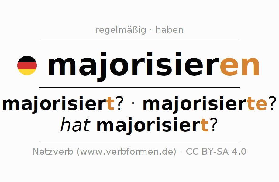 - Präsens: majorisier(e) ich?, majorisierst du?, majorisiert er?, majorisieren wir?, majorisiert ihr?, majorisieren sie?