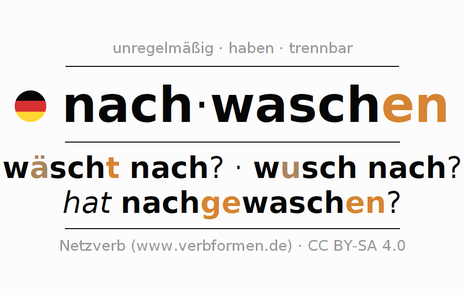 - Präsens: wasch(e) (du) nach, waschen wir nach, wascht (ihr) nach, waschen Sie nach