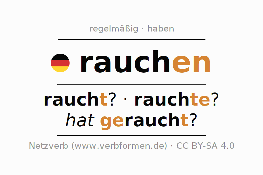 - Präsens: rauch(e) (du), rauchen wir, raucht (ihr), rauchen Sie
