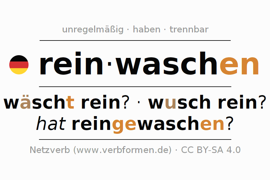 Die rein·waschen Konjugation online als Verbtabelle mit allen Verbformen in Singular (Einzahl) und Plural (Mehrzahl) in allen Personen (1. Person, 2.Person, 3. Person) übersichtlich dargestellt. Die Beugung bzw. Flexion des Verbs rein·waschen ist somit eine Hilfestellung für Hausaufgaben, Prüfungen, Klausuren, für den Deutschuntericht der Schule, zum Deutsch Lernen, für das Studium, Deutsch als Fremdsprache (DaZ), Deutsch als Zweitsprache (DaZ) und für die Erwachsenenbildung. Gerade auch für Deutschlernende ist die korrekte Konjugation des Verbs bzw. die korrekt flektierten Formen (wäscht rein? - wusch rein? - hat reingewaschen?) entscheidend. Weitere Informationen finden sich unter Wiktionary reinwaschen und unter reinwaschen im Duden.