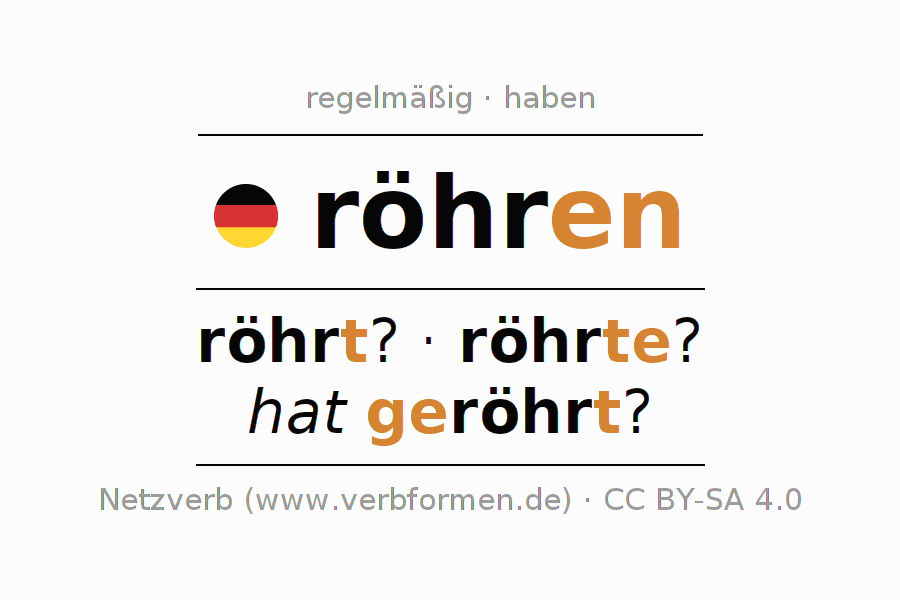 Das Verb röhren (hat) konjugiert im Indikativ Aktiv in den Zeitformen Gegenwart, Vergangenheit und Zukunft