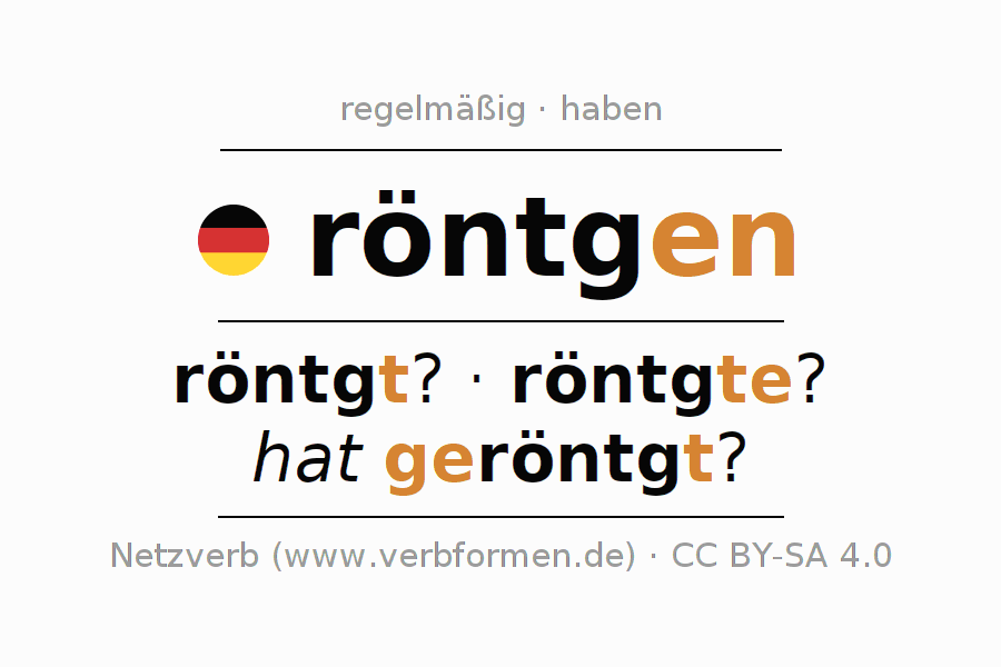 - Präsens: röntg(e) (du), röntgen wir, röntgt (ihr), röntgen Sie
