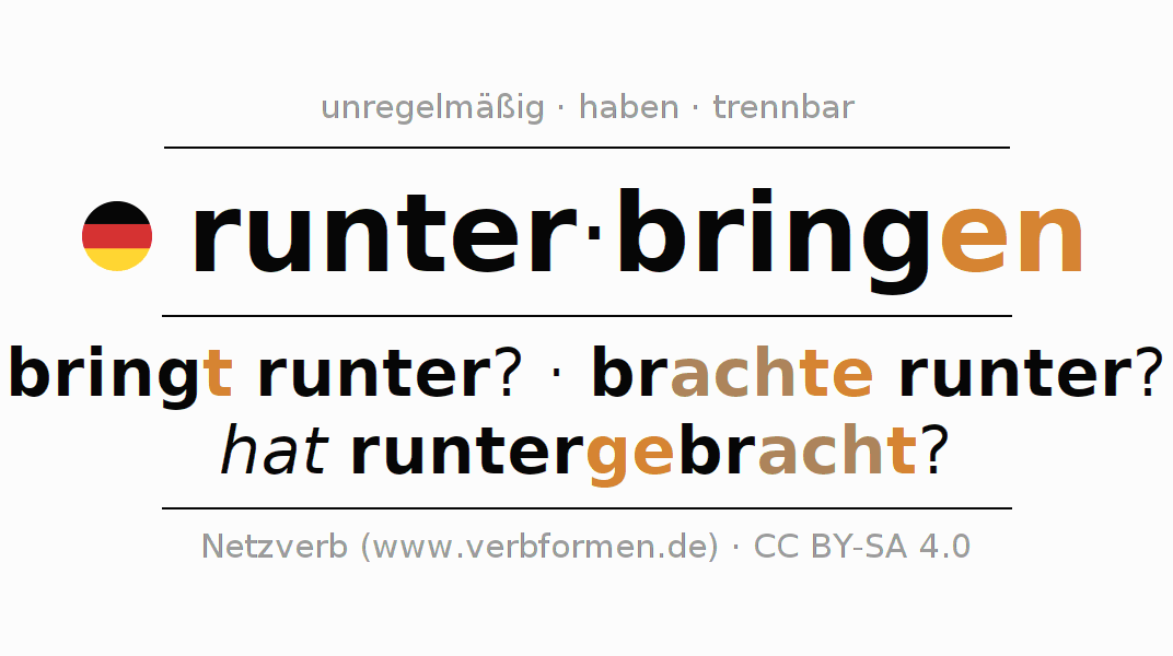 - Präsens: bring(e) (du) runter, bringen wir runter, bringt (ihr) runter, bringen Sie runter