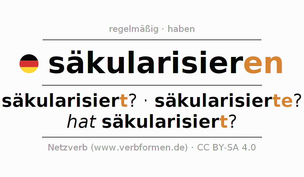 - Perfekt: habe ich säkularisiert?, hast du säkularisiert?, hat er säkularisiert?, haben wir säkularisiert?, habt ihr säkularisiert?, haben sie säkularisiert?