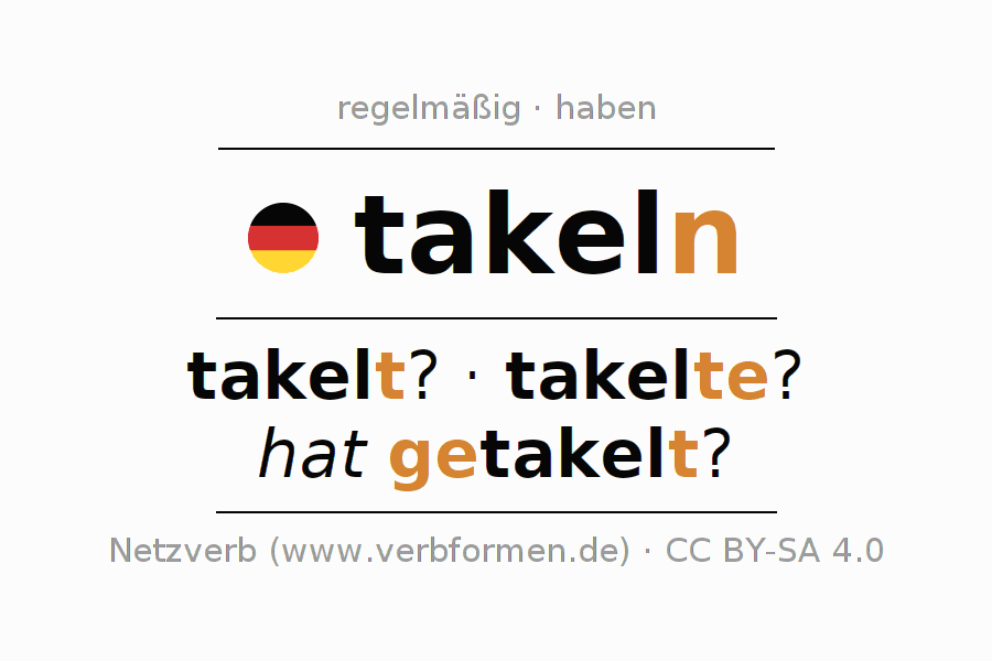 - Präsens: tak(e)l(e) (du), takeln wir, takelt (ihr), takeln Sie