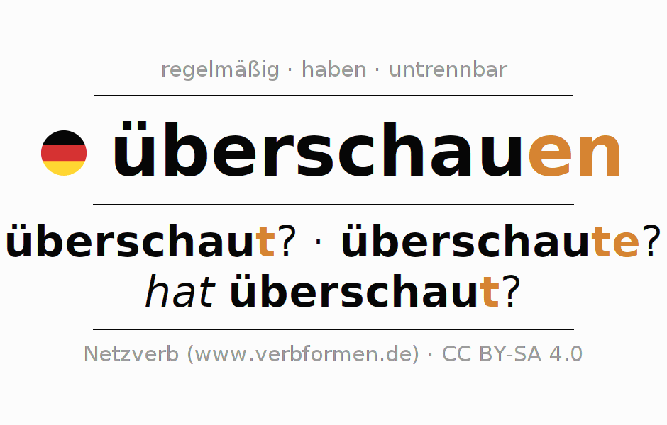 - Perfekt: habe ich überschaut?, hast du überschaut?, hat er überschaut?, haben wir überschaut?, habt ihr überschaut?, haben sie überschaut?
