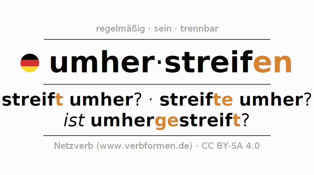 - Präsens: streif(e) (du) umher, streifen wir umher, streift (ihr) umher, streifen Sie umher