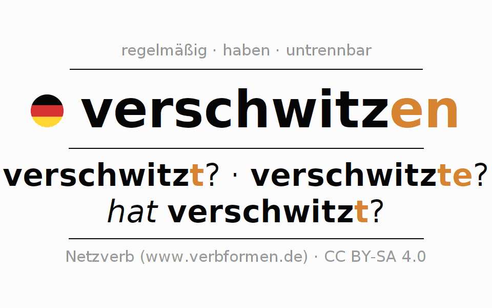 - Präsens: verschwitze ich?, verschwitzest du?, verschwitze er?, verschwitzen wir?, verschwitzet ihr?, verschwitzen sie?