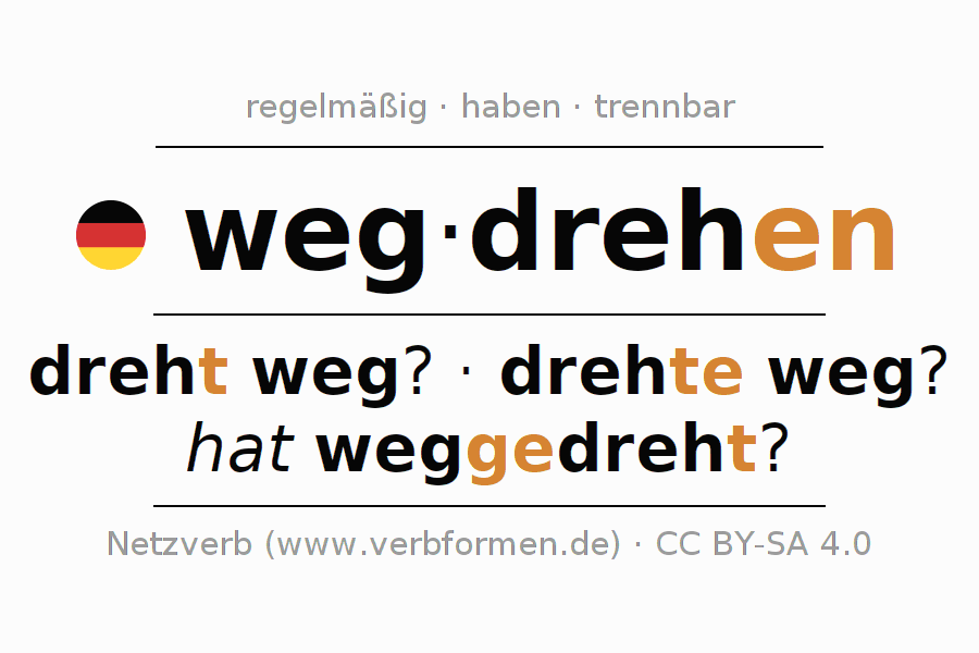 - Futur I: werde ich wegdreh(e)n?, wirst du wegdreh(e)n?, wird er wegdreh(e)n?, werden wir wegdreh(e)n?, werdet ihr wegdreh(e)n?, werden sie wegdreh(e)n?