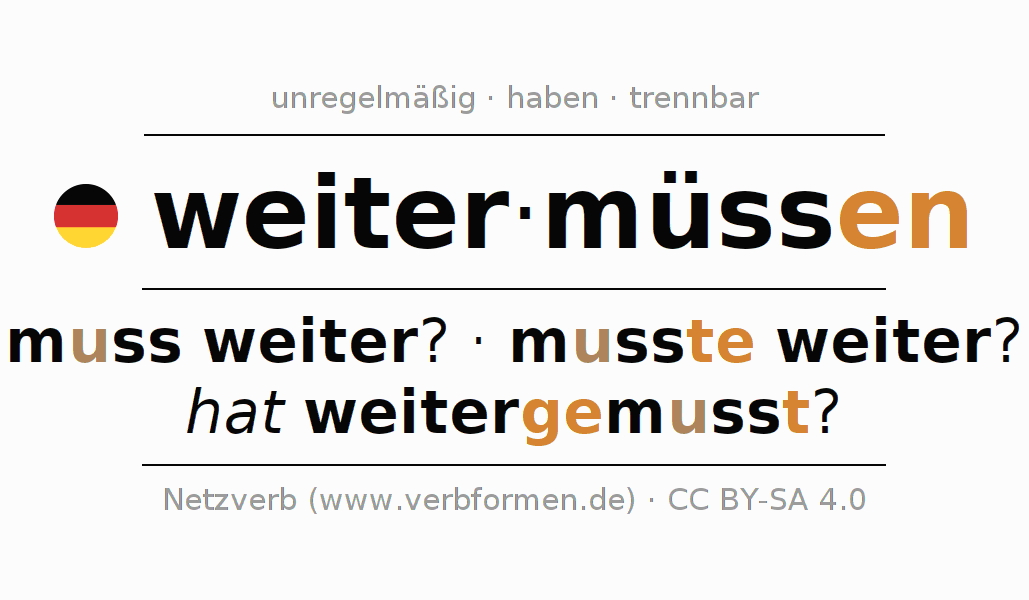 - Futur I: werde ich weitermüssen?, wirst du weitermüssen?, wird er weitermüssen?, werden wir weitermüssen?, werdet ihr weitermüssen?, werden sie weitermüssen?