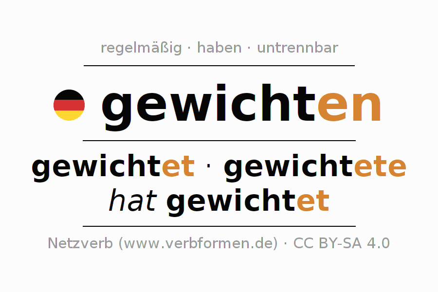 Das Verb gewichten konjugiert im Indikativ Aktiv in den Zeitformen Gegenwart, Vergangenheit und Zukunft