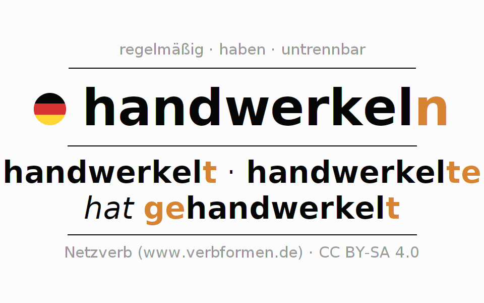Die handwerkeln Konjugation online als Verbtabelle mit allen Verbformen in Singular (Einzahl) und Plural (Mehrzahl) in allen Personen (1. Person, 2.Person, 3. Person) übersichtlich dargestellt. Die Beugung bzw. Flexion des Verbs handwerkeln ist somit eine Hilfestellung für Hausaufgaben, Prüfungen, Klausuren, für den Deutschuntericht der Schule, zum Deutsch Lernen, für das Studium, Deutsch als Fremdsprache (DaZ), Deutsch als Zweitsprache (DaZ) und für die Erwachsenenbildung. Gerade auch für Deutschlernende ist die korrekte Konjugation des Verbs bzw. die korrekt flektierten Formen (handwerkelt - handwerkelte - hat gehandwerkelt) entscheidend. Weitere Informationen finden sich unter Wiktionary handwerkeln und unter handwerkeln im Duden.