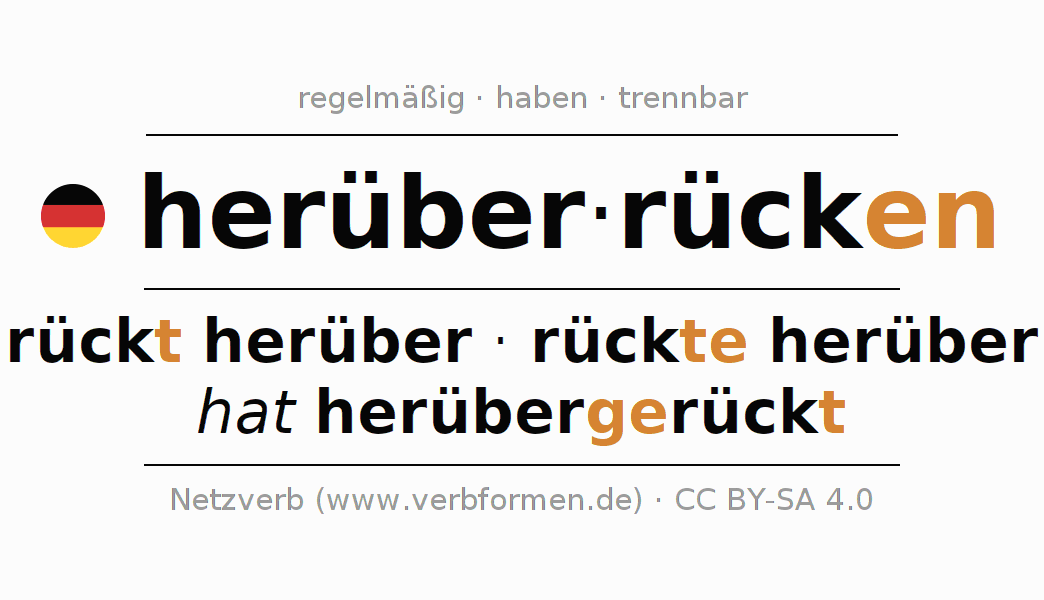 - Präsens: rück(e) (du) herüber, rücken wir herüber, rückt (ihr) herüber, rücken Sie herüber