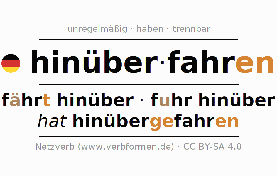 - Präsens: fahr(e) (du) hinüber, fahren wir hinüber, fahrt (ihr) hinüber, fahren Sie hinüber