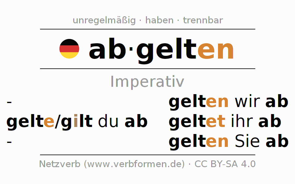Das Verb abgelten vollständig in allen Personen und Numeri im Imperativ Präsens konjugiert