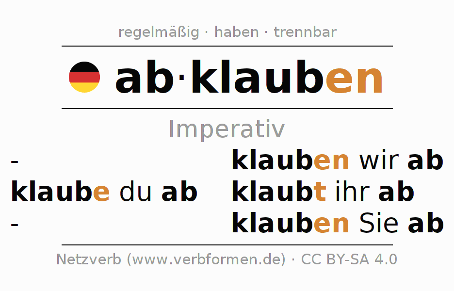 Das Verb abklauben vollständig in allen Personen und Numeri im Imperativ Präsens konjugiert