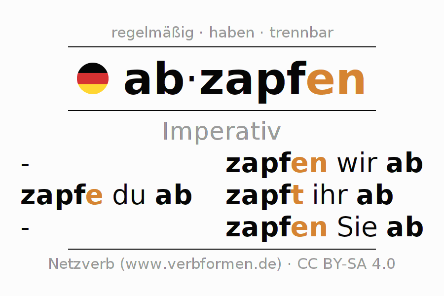Das Verb abzapfen vollständig in allen Personen und Numeri im Imperativ Präsens konjugiert