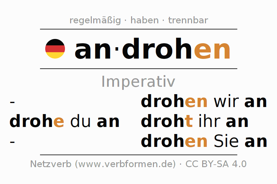 Das Verb androhen vollständig in allen Personen und Numeri im Imperativ Präsens konjugiert