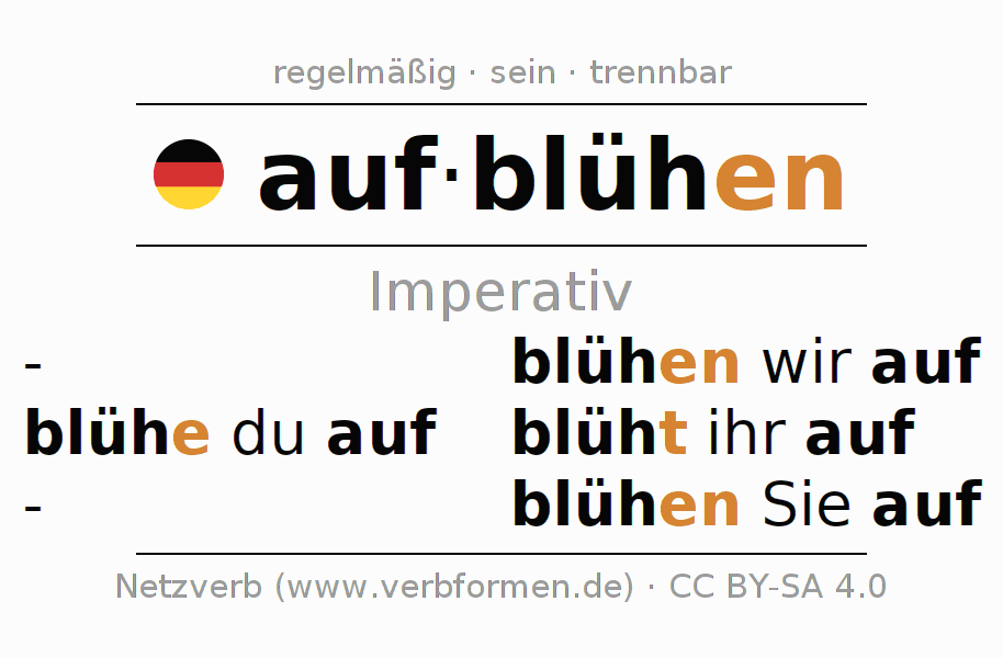 Das Verb aufblühen vollständig in allen Personen und Numeri im Imperativ Präsens konjugiert