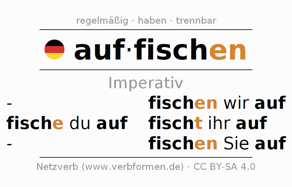 Das Verb auffischen vollständig in allen Personen und Numeri im Imperativ Präsens konjugiert