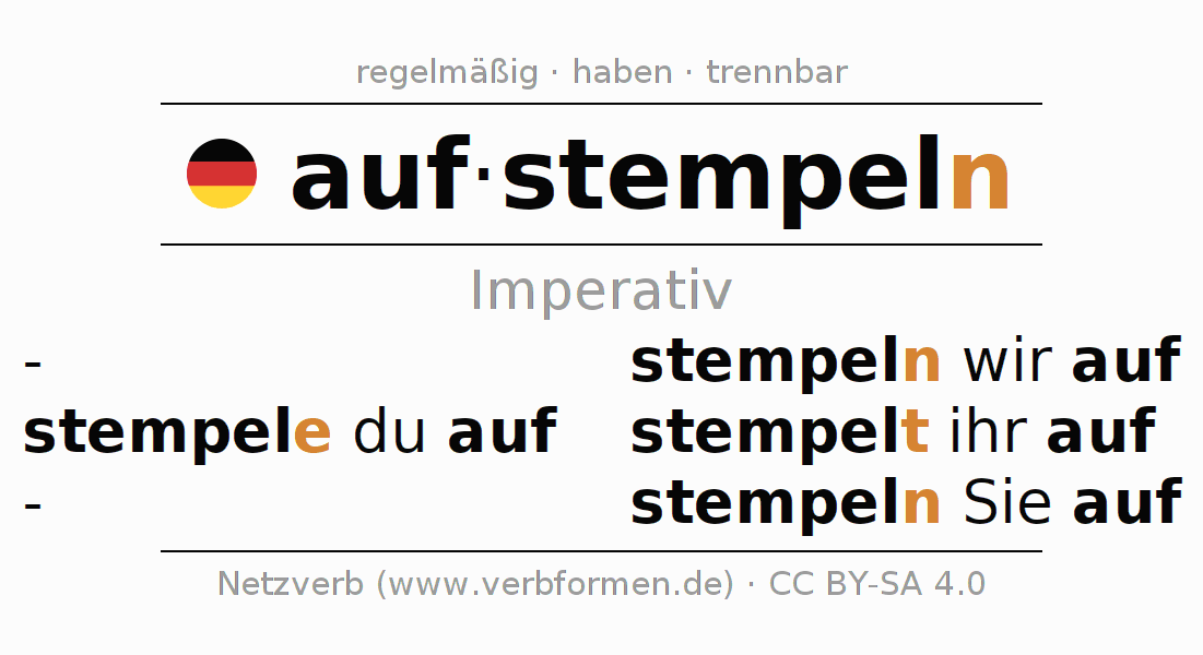 Das Verb aufstempeln vollständig in allen Personen und Numeri im Imperativ Präsens konjugiert