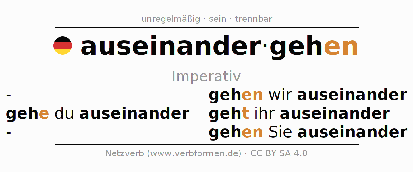 Das Verb auseinandergehen vollständig in allen Personen und Numeri im Imperativ Präsens konjugiert