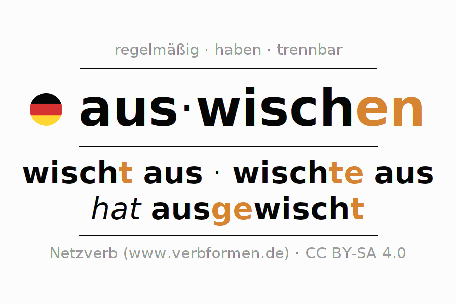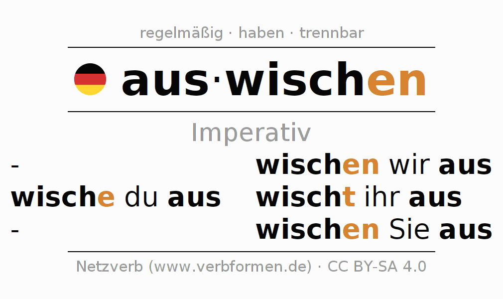 Das Verb auswischen (hat) vollständig in allen Personen und Numeri im Imperativ Präsens konjugiert