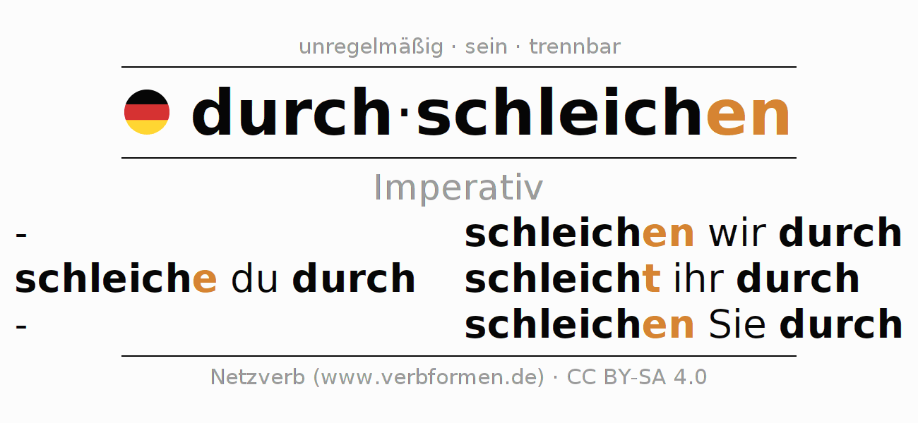 Das Verb durchschleichen vollständig in allen Personen und Numeri im Imperativ Präsens konjugiert