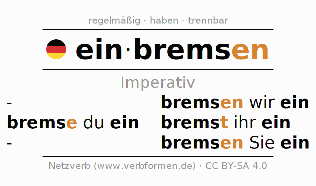 Das Verb einbremsen vollständig in allen Personen und Numeri im Imperativ Präsens konjugiert