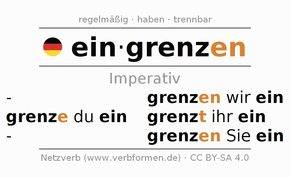 Das Verb eingrenzen vollständig in allen Personen und Numeri im Imperativ Präsens konjugiert