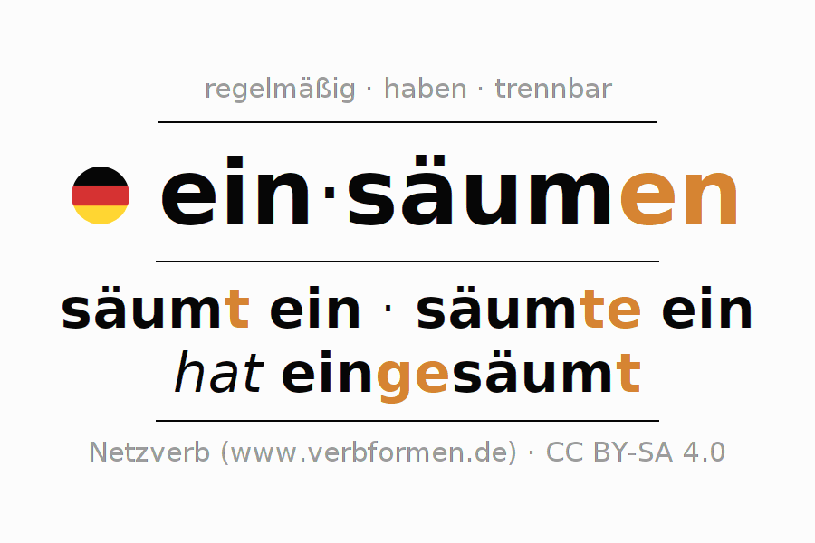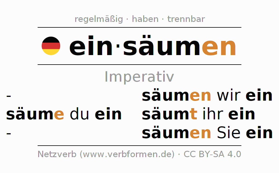 Das Verb einsäumen vollständig in allen Personen und Numeri im Imperativ Präsens konjugiert