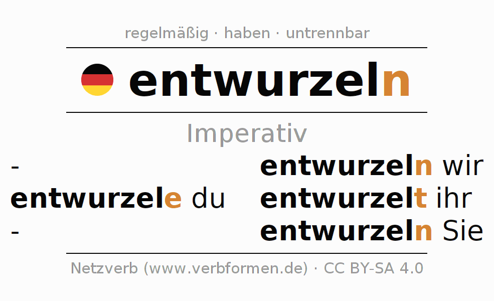Das Verb entwurzeln vollständig in allen Personen und Numeri im Imperativ Präsens konjugiert