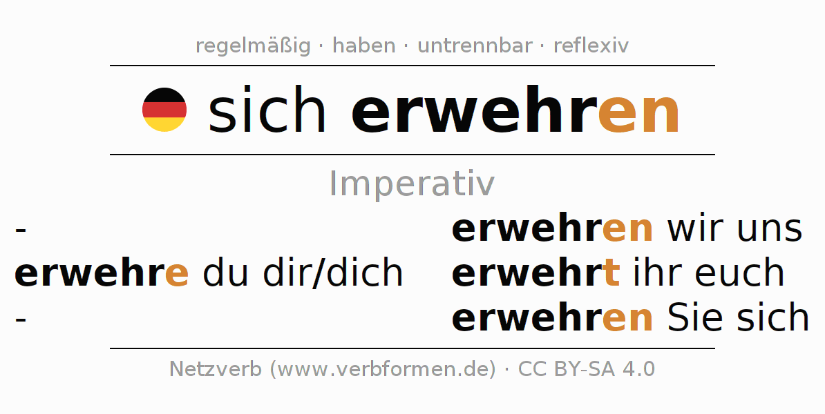 Das Verb sich erwehren vollständig in allen Personen und Numeri im Imperativ Präsens konjugiert