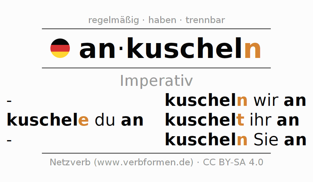 Das Verb ankuscheln vollständig in allen Personen und Numeri im Imperativ Präsens konjugiert