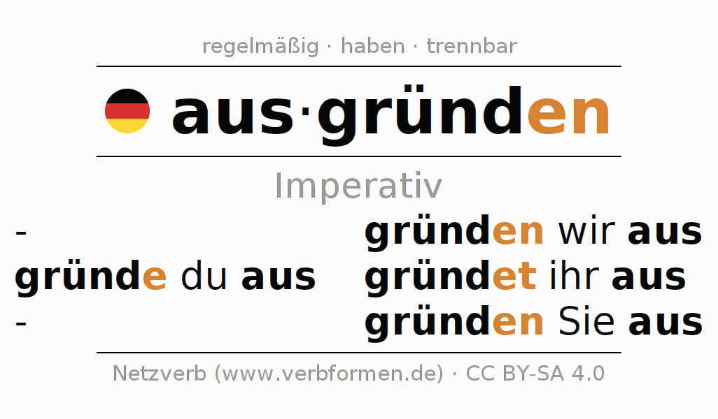 Das Verb ausgründen vollständig in allen Personen und Numeri im Imperativ Präsens konjugiert