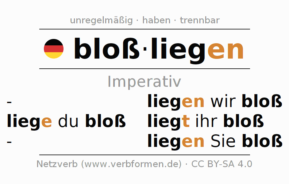 Das Verb bloßliegen (hat) vollständig in allen Personen und Numeri im Imperativ Präsens konjugiert