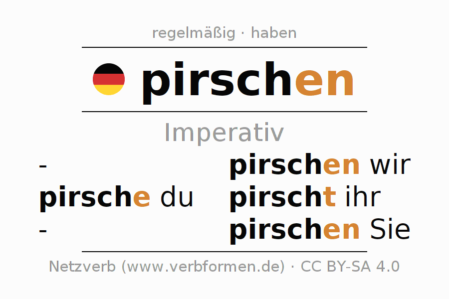 Das Verb pirschen (hat) vollständig in allen Personen und Numeri im Imperativ Präsens konjugiert