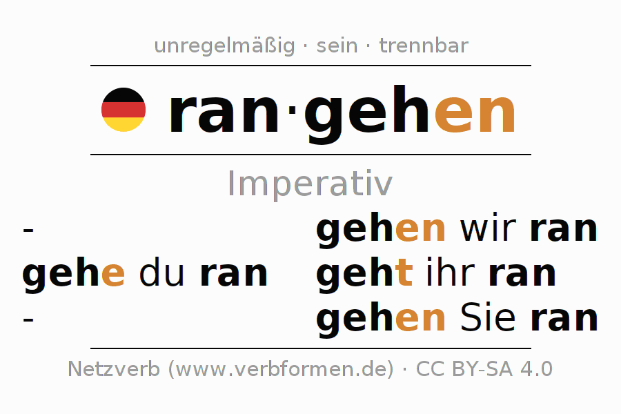 Das Verb rangehen vollständig in allen Personen und Numeri im Imperativ Präsens konjugiert
