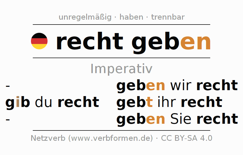 Das Verb rechtgeben vollständig in allen Personen und Numeri im Imperativ Präsens konjugiert