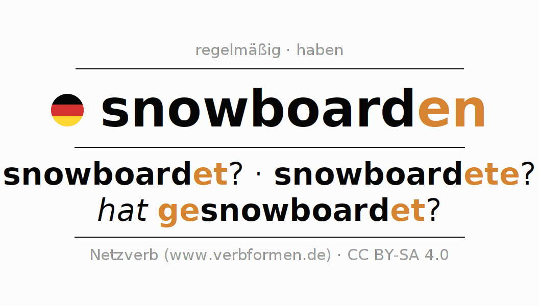 Das Verb snowboarden (hat) vollständig in allen Personen und Numeri im Imperativ Präsens konjugiert