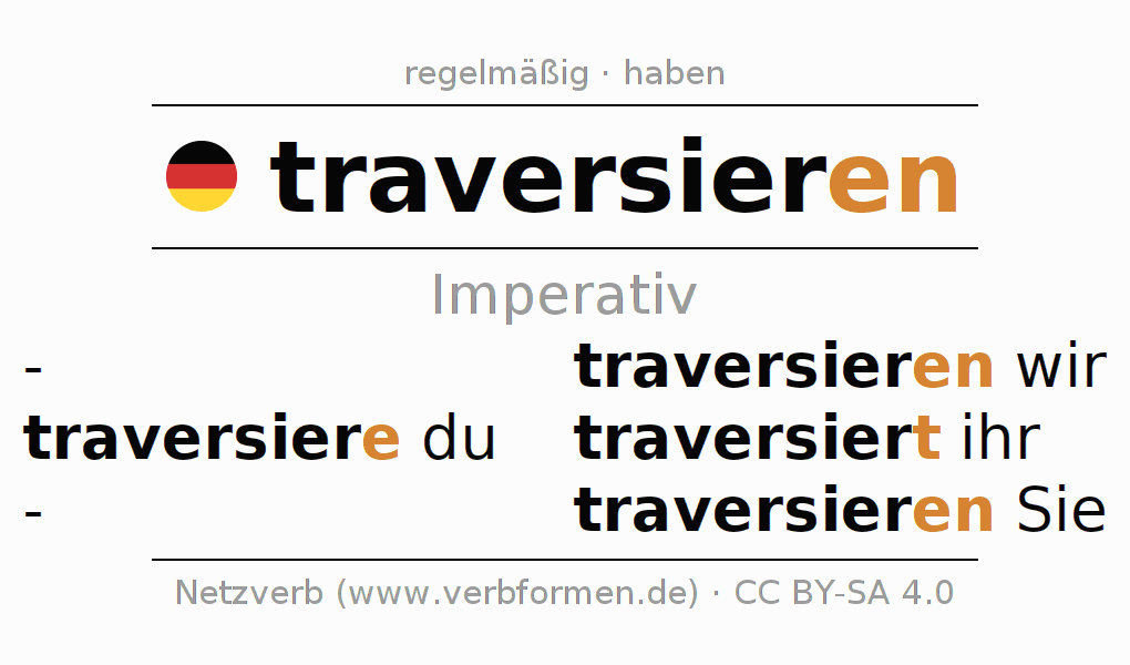 Das Verb traversieren (hat) vollständig in allen Personen und Numeri im Imperativ Präsens konjugiert