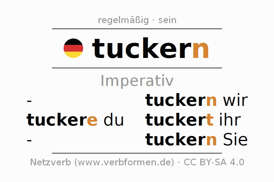 Die Konjugation von tuckern im Imperativ Präsens Befehlsform Aktiv ist: tuck(e)re (du), tuckern wir, tuckert (ihr), tuckern Sie.Die Bildung dieser Formen entspricht gewissen grammatischen Regeln. So auch die Vorgaben zur Konjugation der einfachen Verbformen von tuckern im Imperativ. Kommentare ☆