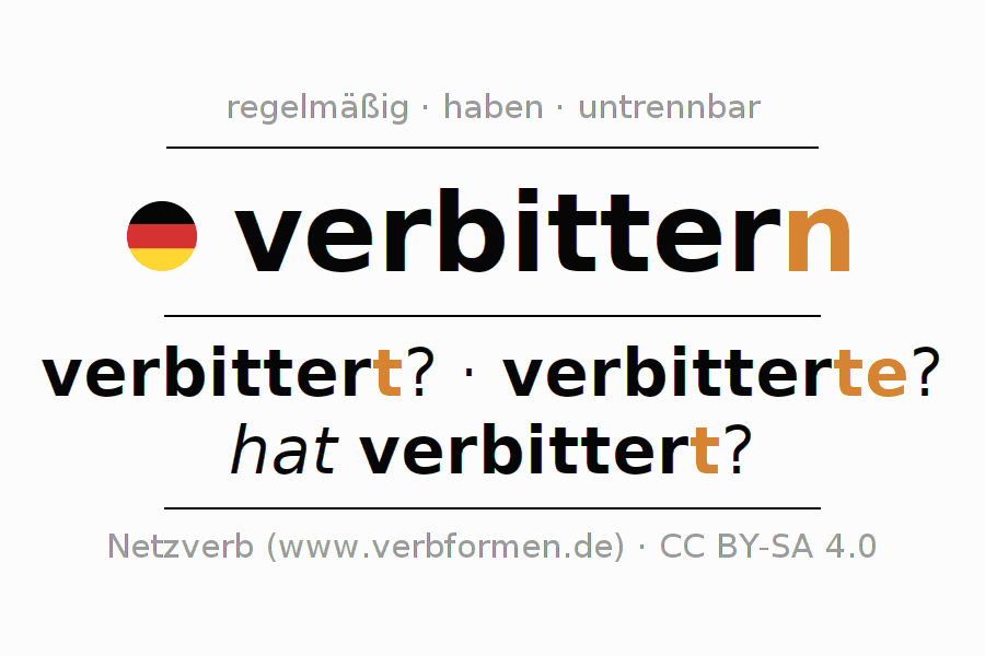 Das Verb verbittern (hat) vollständig in allen Personen und Numeri im Imperativ Präsens konjugiert