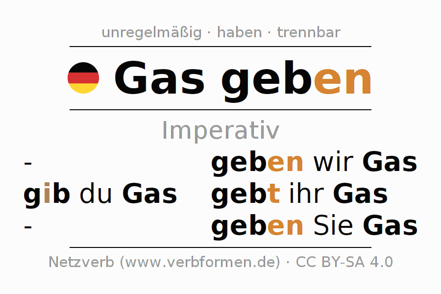 Das Verb gasgeben vollständig in allen Personen und Numeri im Imperativ Präsens konjugiert
