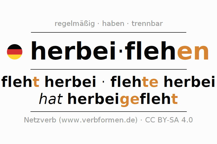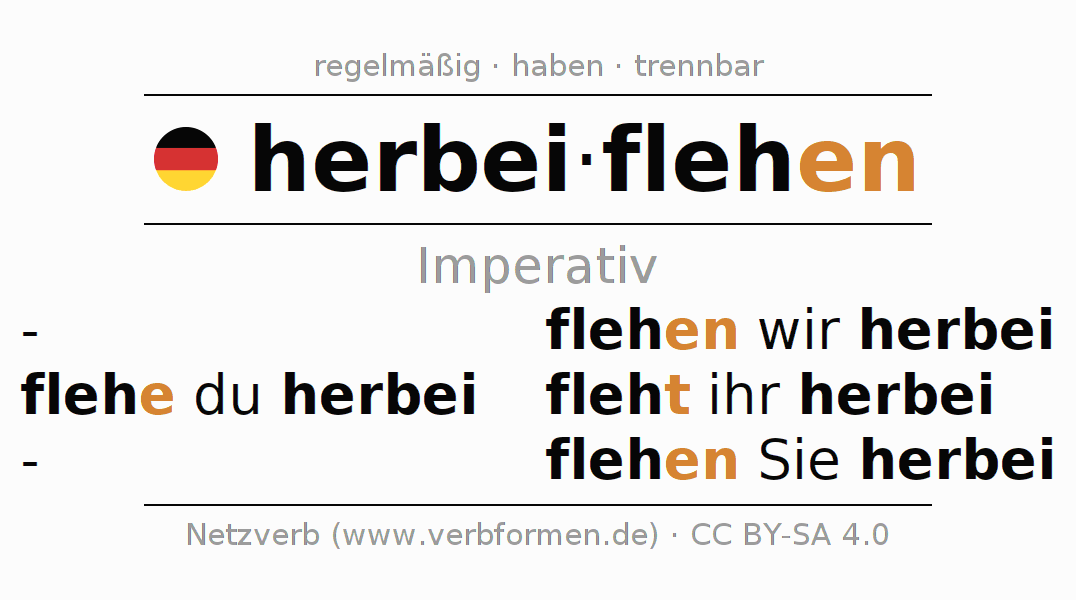 Das Verb herbeiflehen vollständig in allen Personen und Numeri im Imperativ Präsens konjugiert