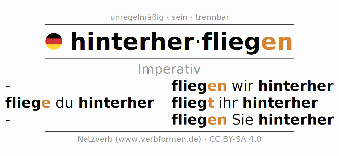 Das Verb hinterherfliegen vollständig in allen Personen und Numeri im Imperativ Präsens konjugiert
